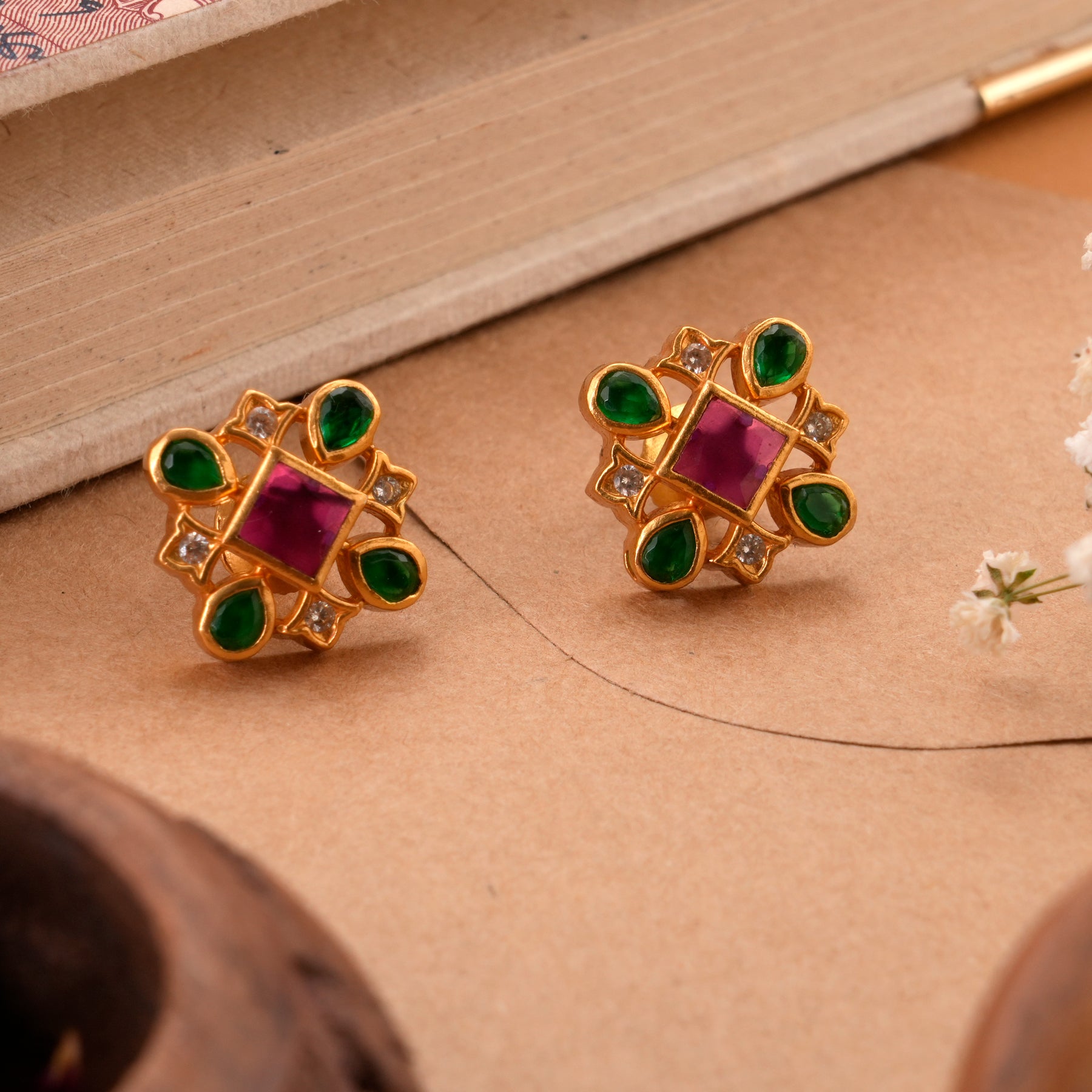 Crafted in 92.5 silver with gold plating, these square Kundan studs feature ruby and emerald stones with polished golden detailing, offering a bright and elegant jewellery design.