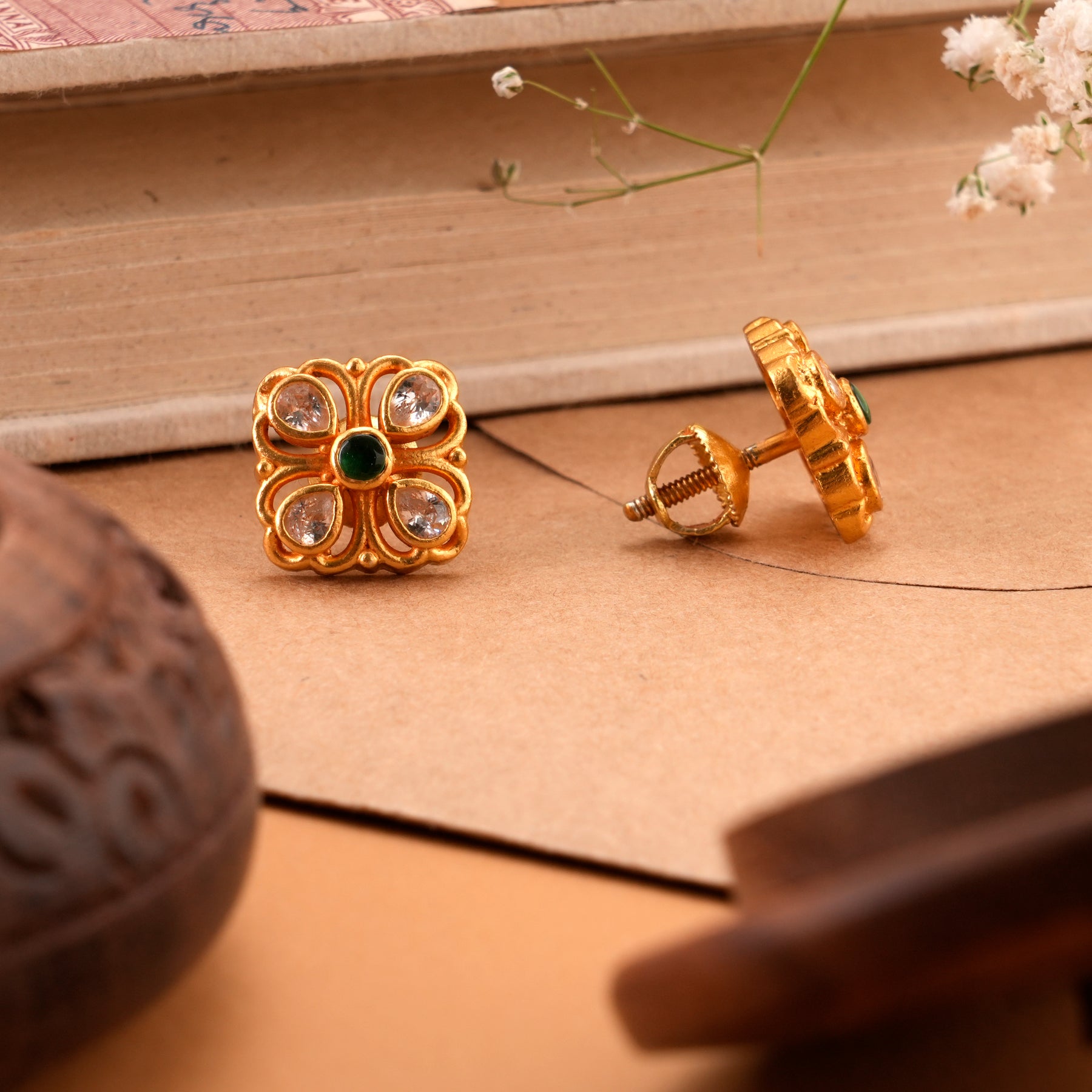 Made in 92.5 silver with gold plating, these square floral Kundan studs feature emerald stones with polished golden accents, giving a bright and elegant jewellery design.
