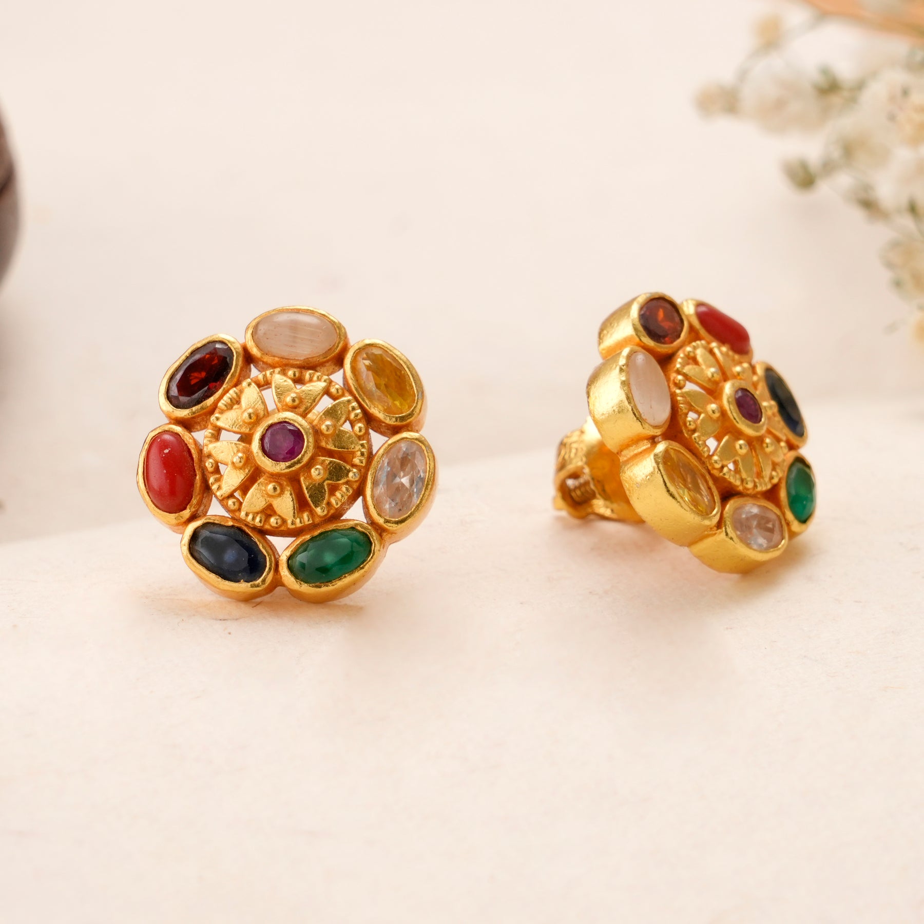 Crafted in 92.5 silver with gold plating, these Kundan studs feature Navaratna stones set in polished golden detailing, reflecting traditional craftsmanship and elegant, vibrant jewellery design.