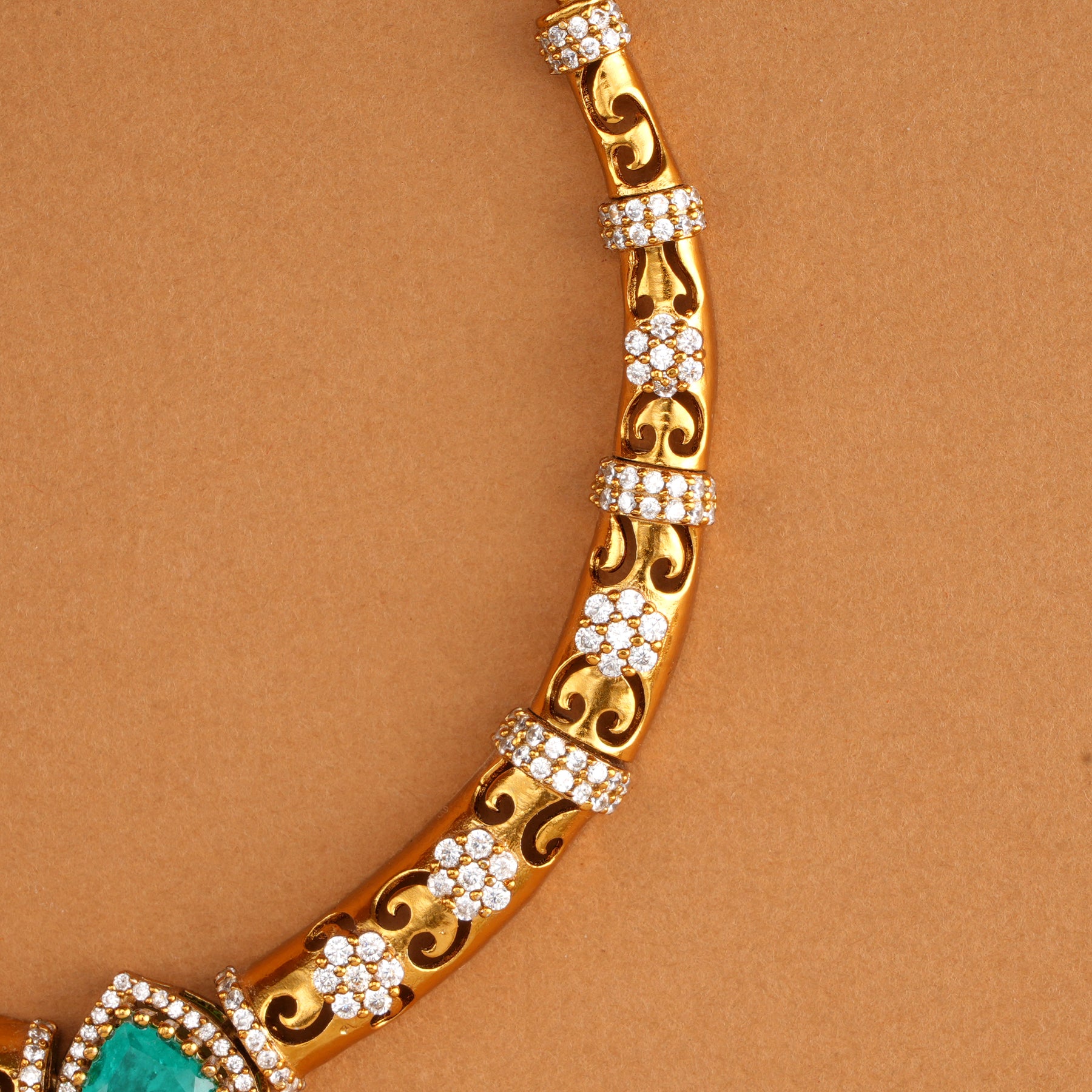 This 92.5 Sterling Silver with gold-plated finish, this necklace features a stunning blend of ruby and emerald Swarovski stones, offering a vibrant and traditional design.