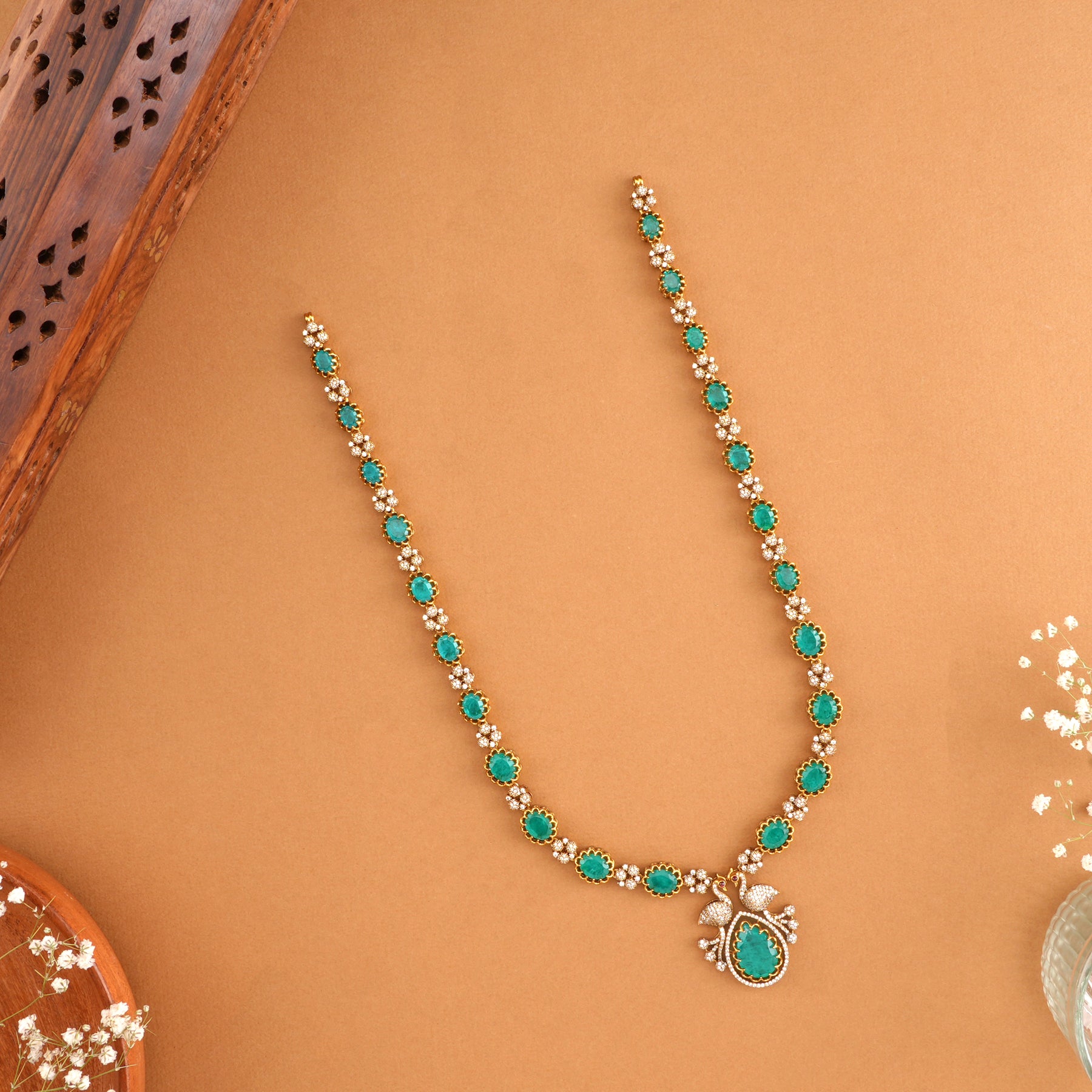 This 92.5 Sterling Silver haram with a gold-plated finish showcases intricate floral designs adorned with Swarovski and emerald stones, exuding traditional charm and festive elegance.