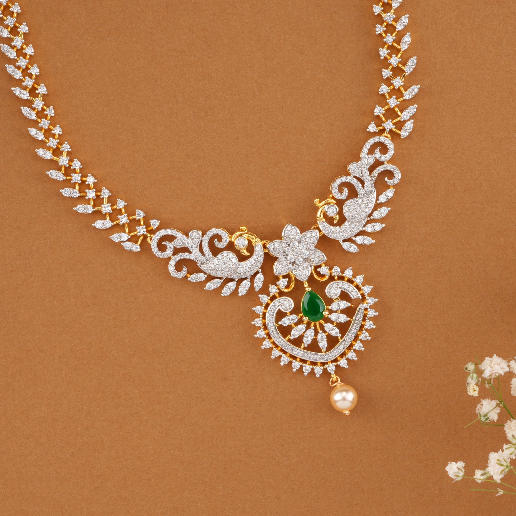 Made with 92.5 silver and a gold-plated finish, this choker features floral motifs adorned with Swarovski emeralds for a chic and elegant look.