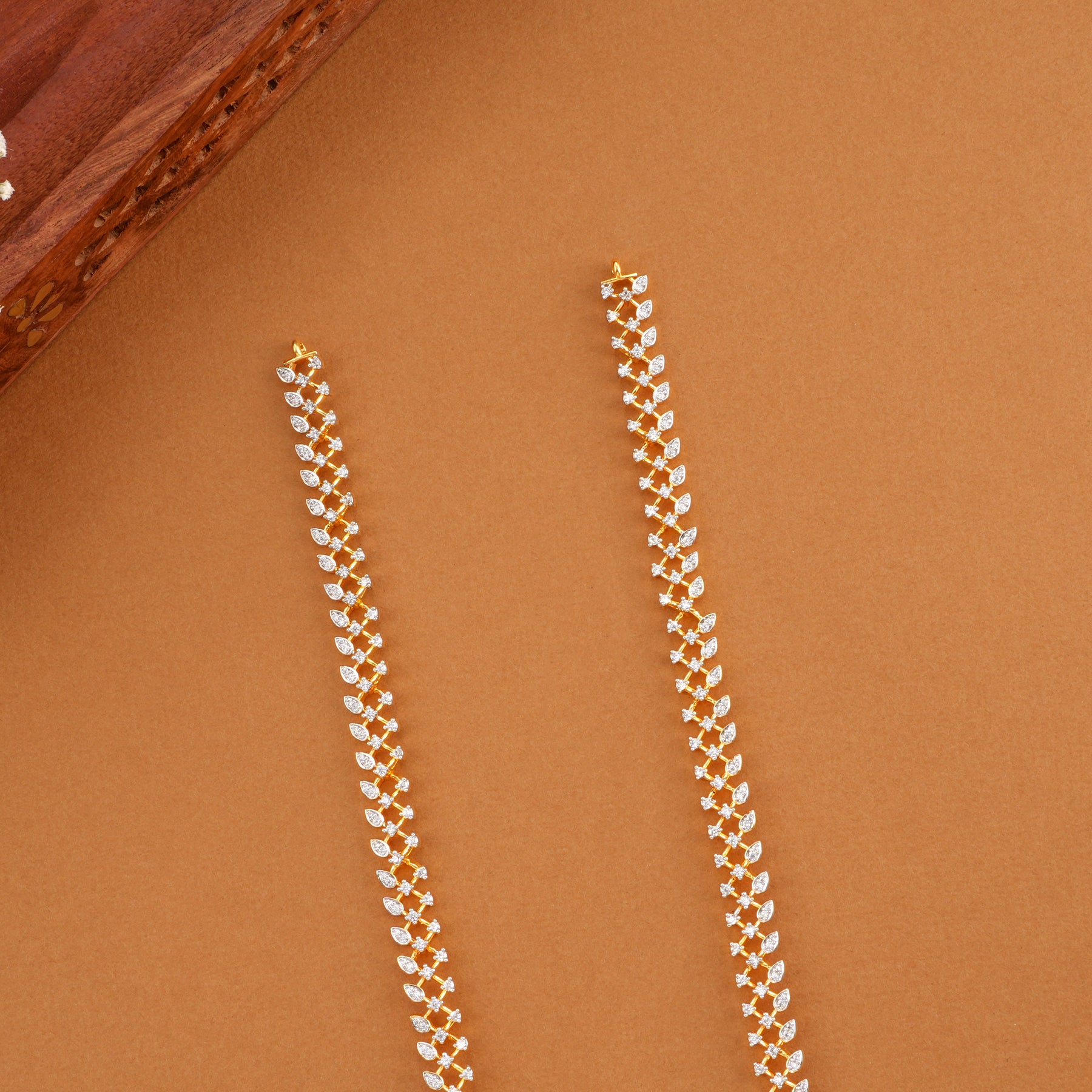 This 92.5 silver and gold-plated finish long haram features Swarovski stones in majestic link patterns, perfect for adding grandeur to festive attire.
