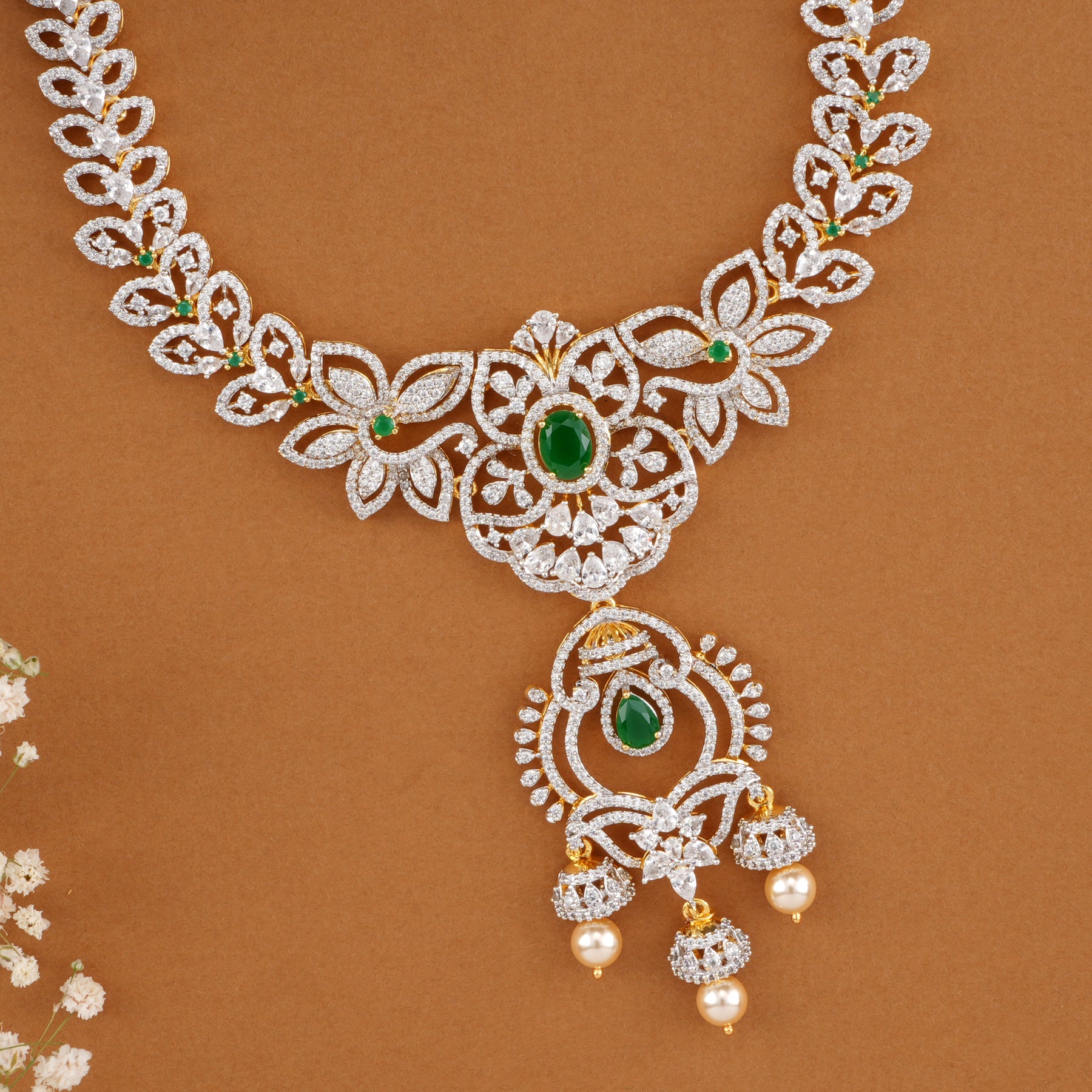 Crafted in 92.5 silver with a gold-plated finish, this necklace features Swarovski pearls and stones arranged in a floral-inspired design for feminine elegance.