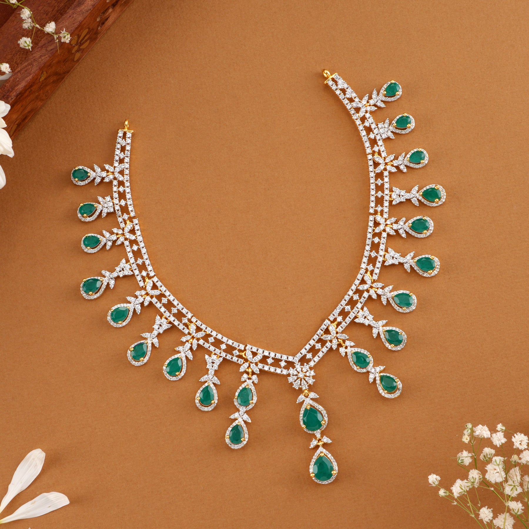 A 92.5 silver and gold-plated finish layered necklace with Swarovski emerald floral motifs, radiating grace and festive charm.