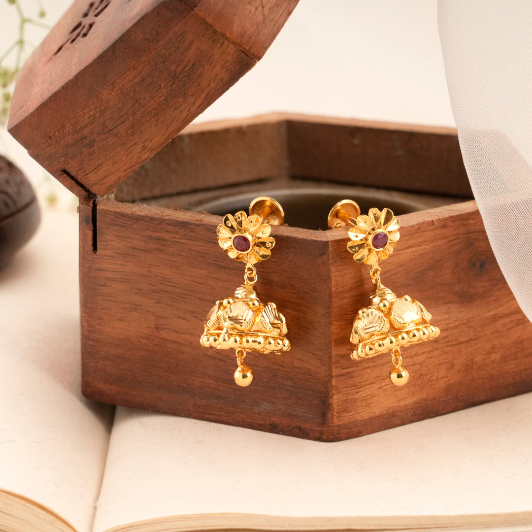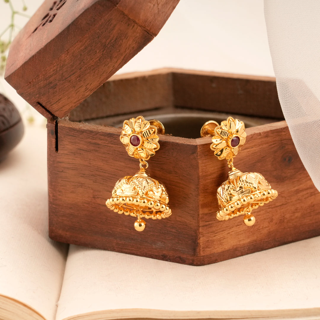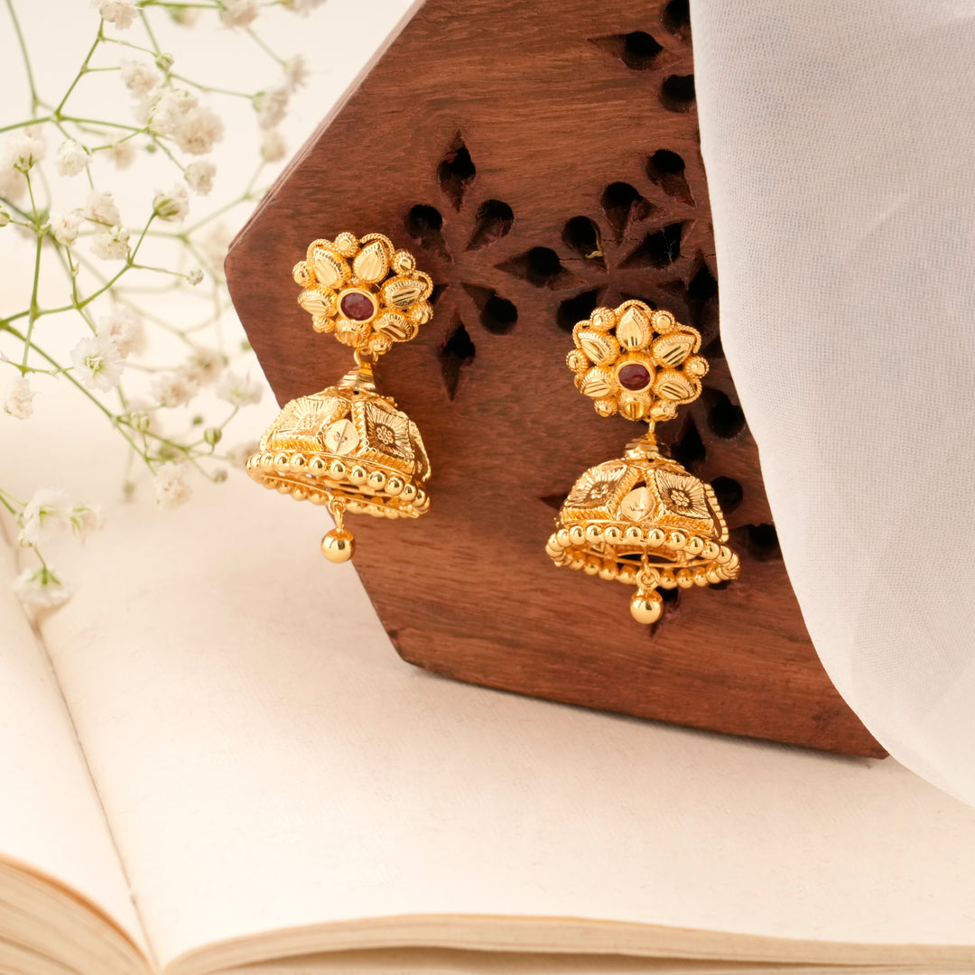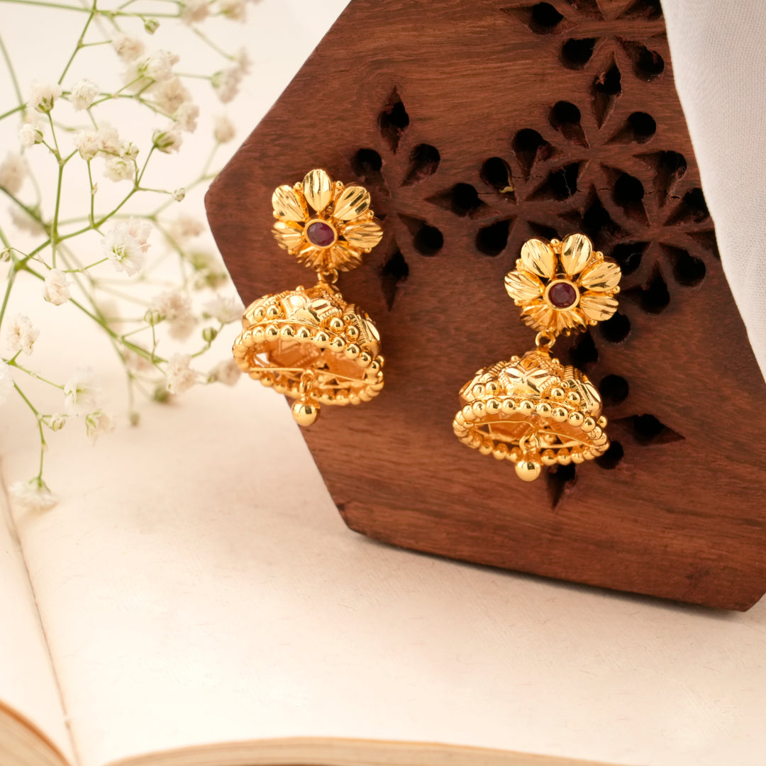 Bloom Pattern Golden Ruby Jhumkas