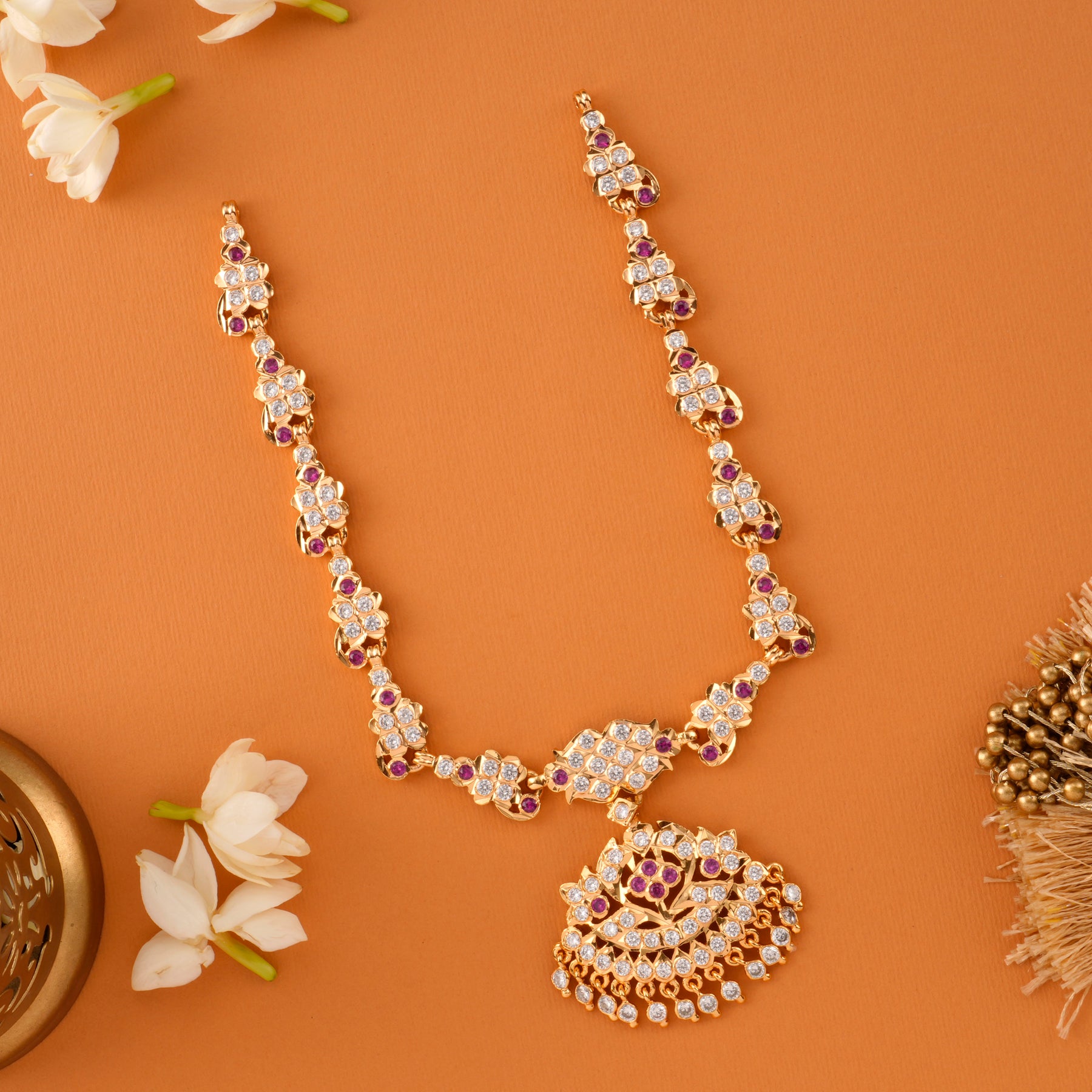 Designed in 92.5 silver with gold plating, this fancy necklace sparkles with white stones, bringing a grand festive glow to traditional ensembles.