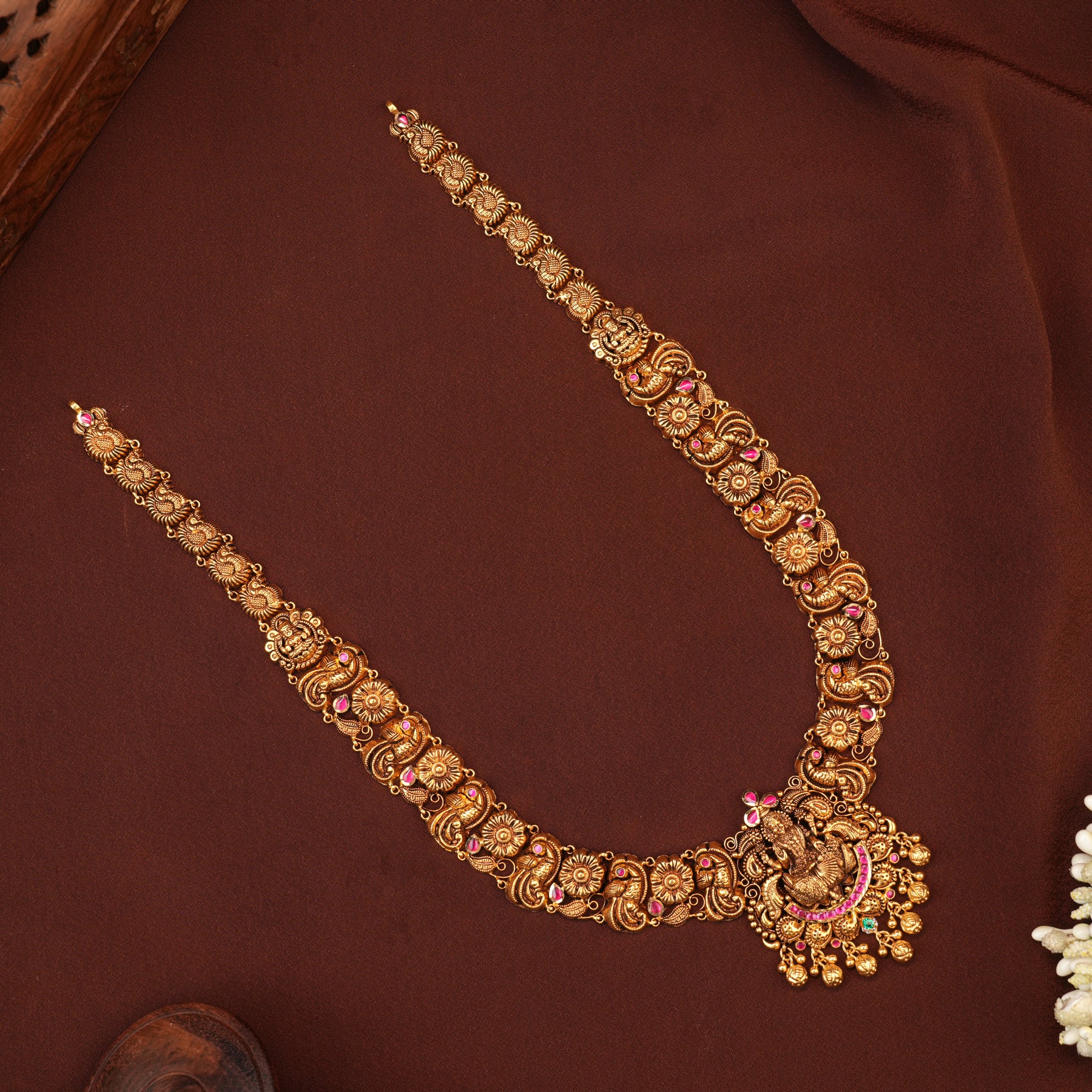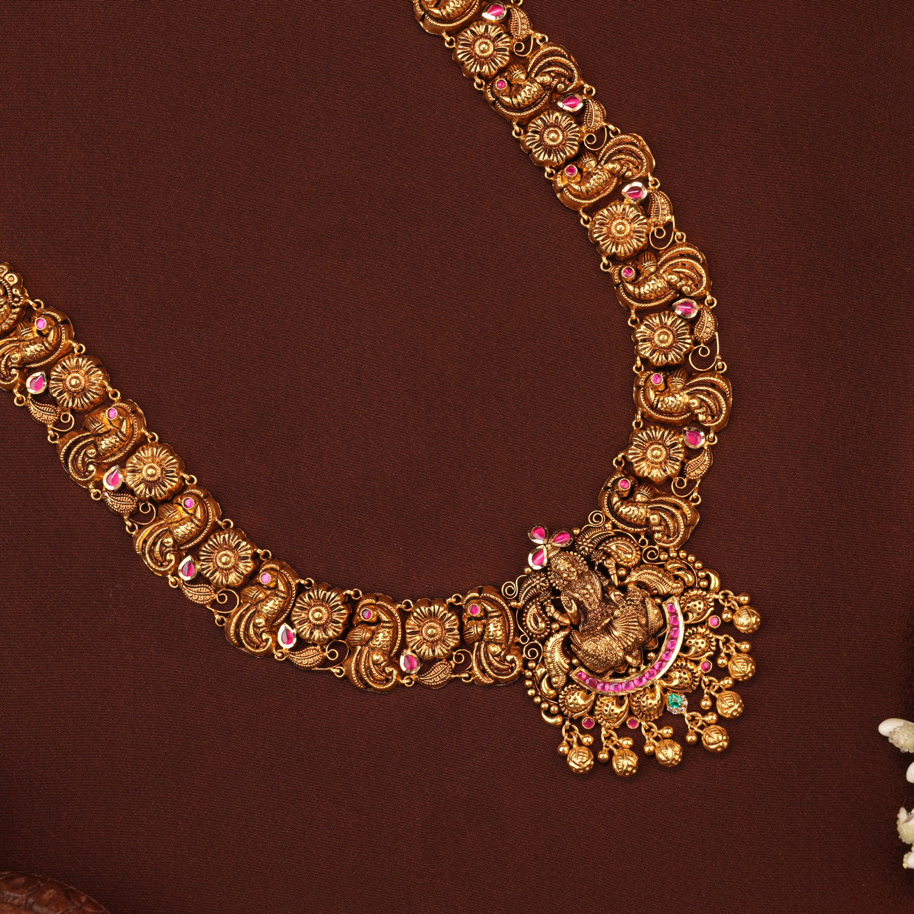 Crafted in 22K gold, this antique haram features Lakshmi design adorned with ruby and emerald stones, showcasing vibrant detailing and traditional craftsmanship.