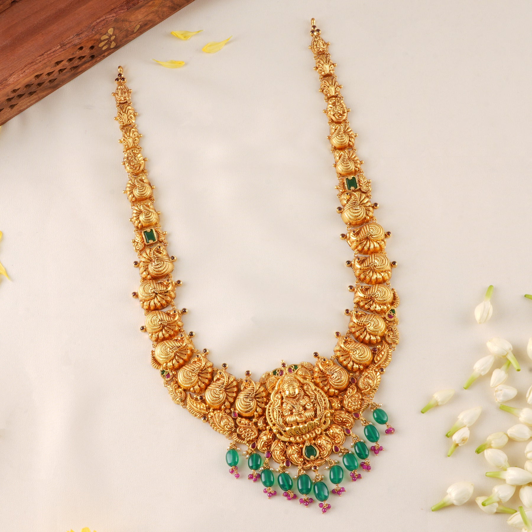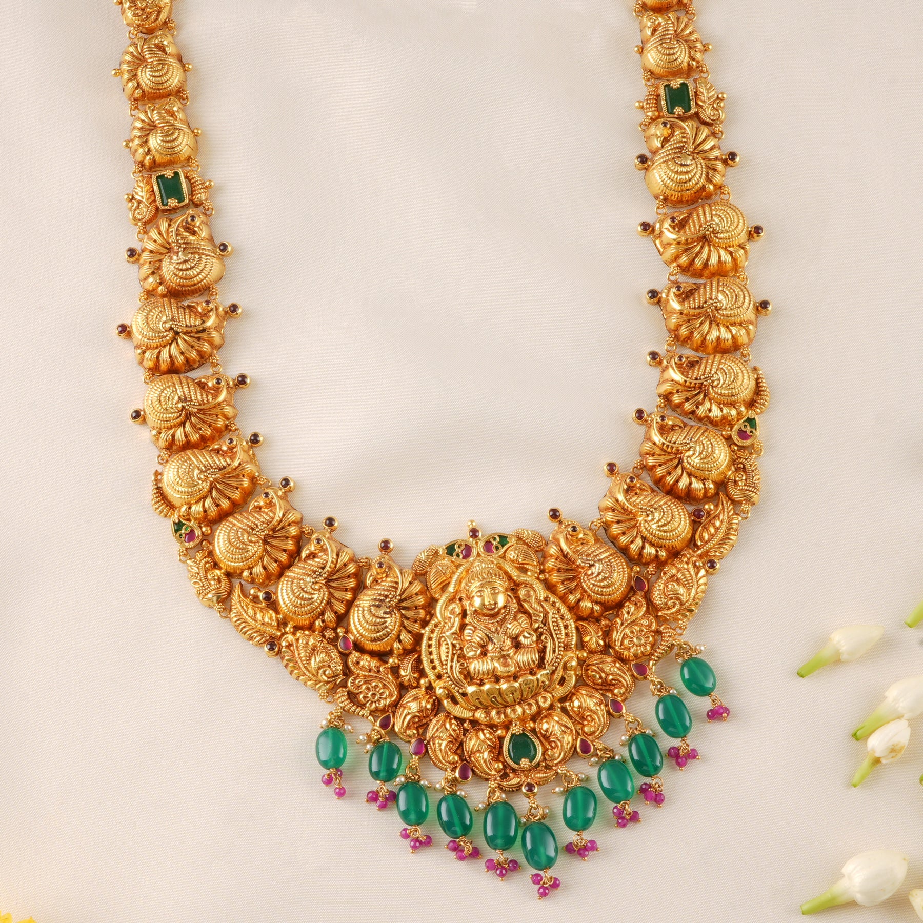 Blending the beauty of peacocks with Goddess Lakshmi motifs, this 22k gold Haram embodies divinity and elegance, perfect for grand occasions.