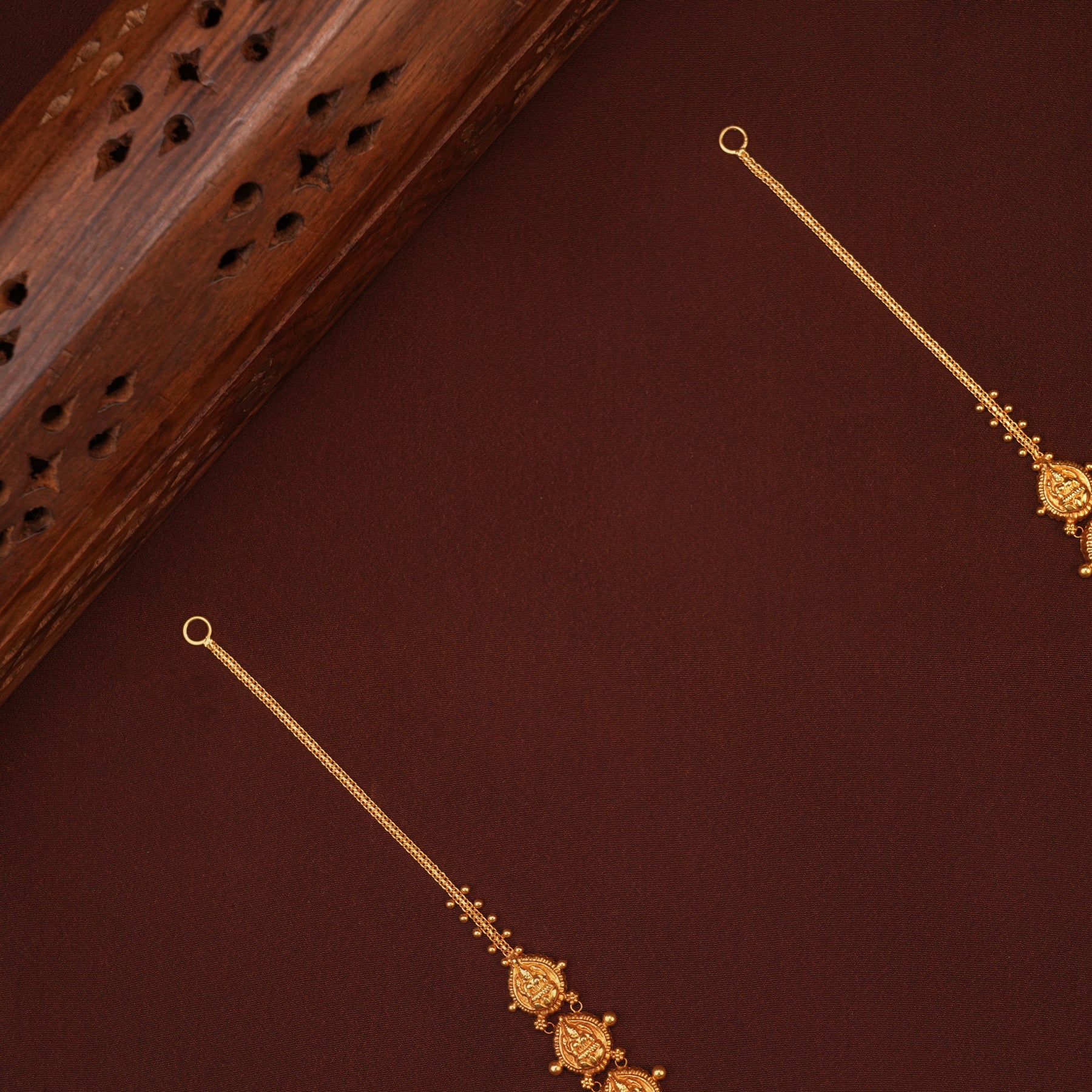 Crafted in 22K gold, this temple haram features Lakshmi design with gold drop detailing, showcasing intricate artistry and traditional finish that adds divine elegance.