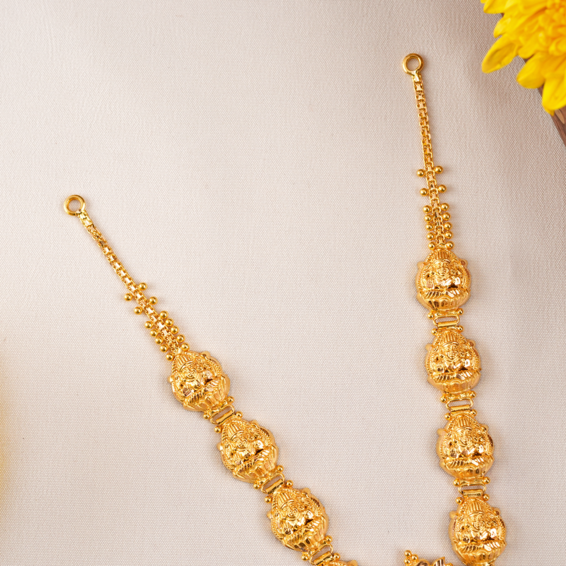 Elegant and radiant, this 22k gold Lakshmi Devi Temple Style Necklace features intricately crafted goddess motifs and antique detailing, making it a masterpiece for weddings, engagements, and festive occasions.
